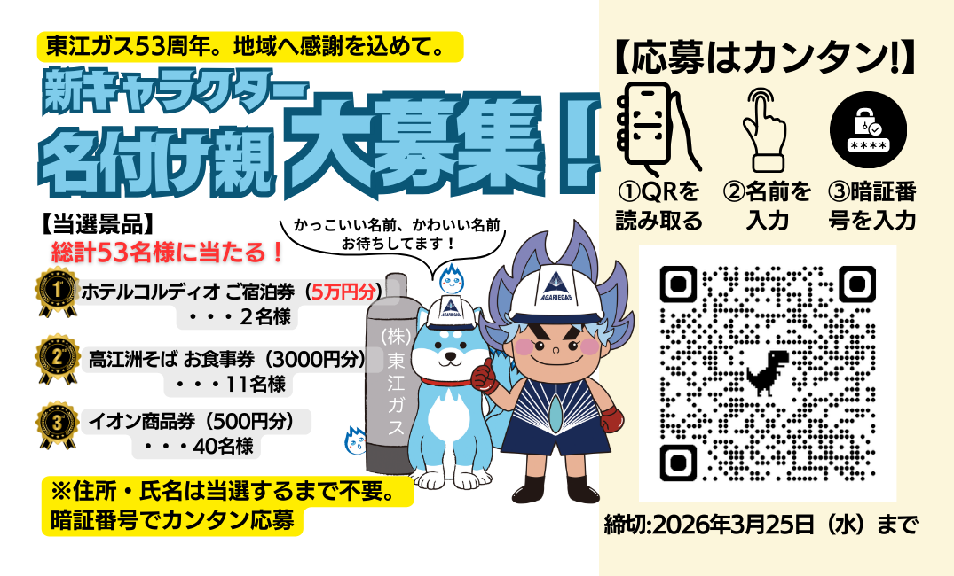【6】注意事項 * 権利の帰属: 採用された名前の著作権、使用権、商標権、その他一切の権利は、東江ガス株式会社に帰属するものとします。 * 個人情報の取り扱い: 当選後にご入力いただく個人情報は、景品の発送および本件に関する諸連絡のみに使用し、適切に管理いたします。 * 無効となる場合: 公序良俗に反する内容、他者の権利を侵害する内容、または当選発表から一定期間ご連絡がない場合は、当選を無効とさせていただく場合がございます。
