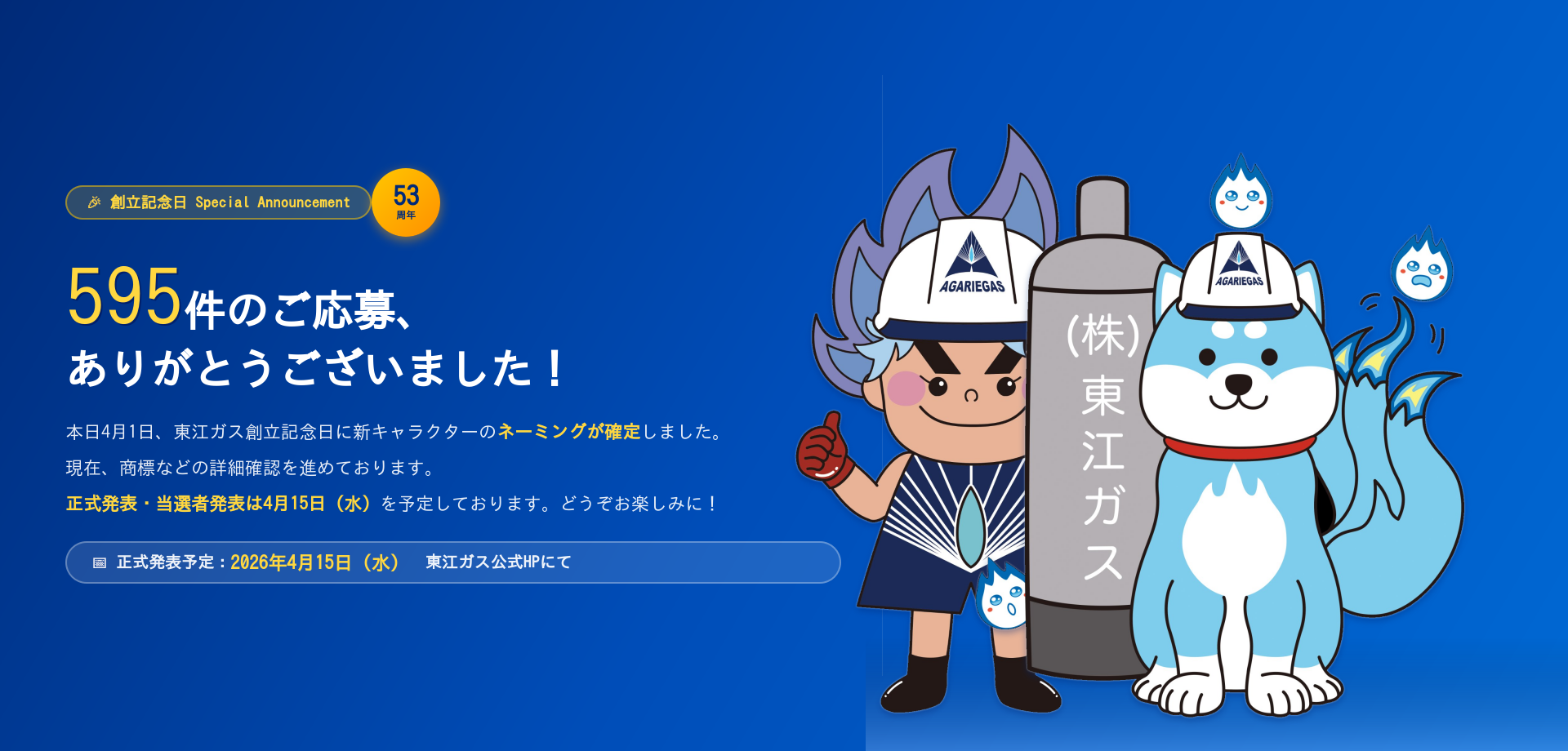 4月1日は、東江ガスの創立記念日です。53周年を迎えたこの特別な日に、新キャラクターのネーミングが確定したことをご報告いたします。